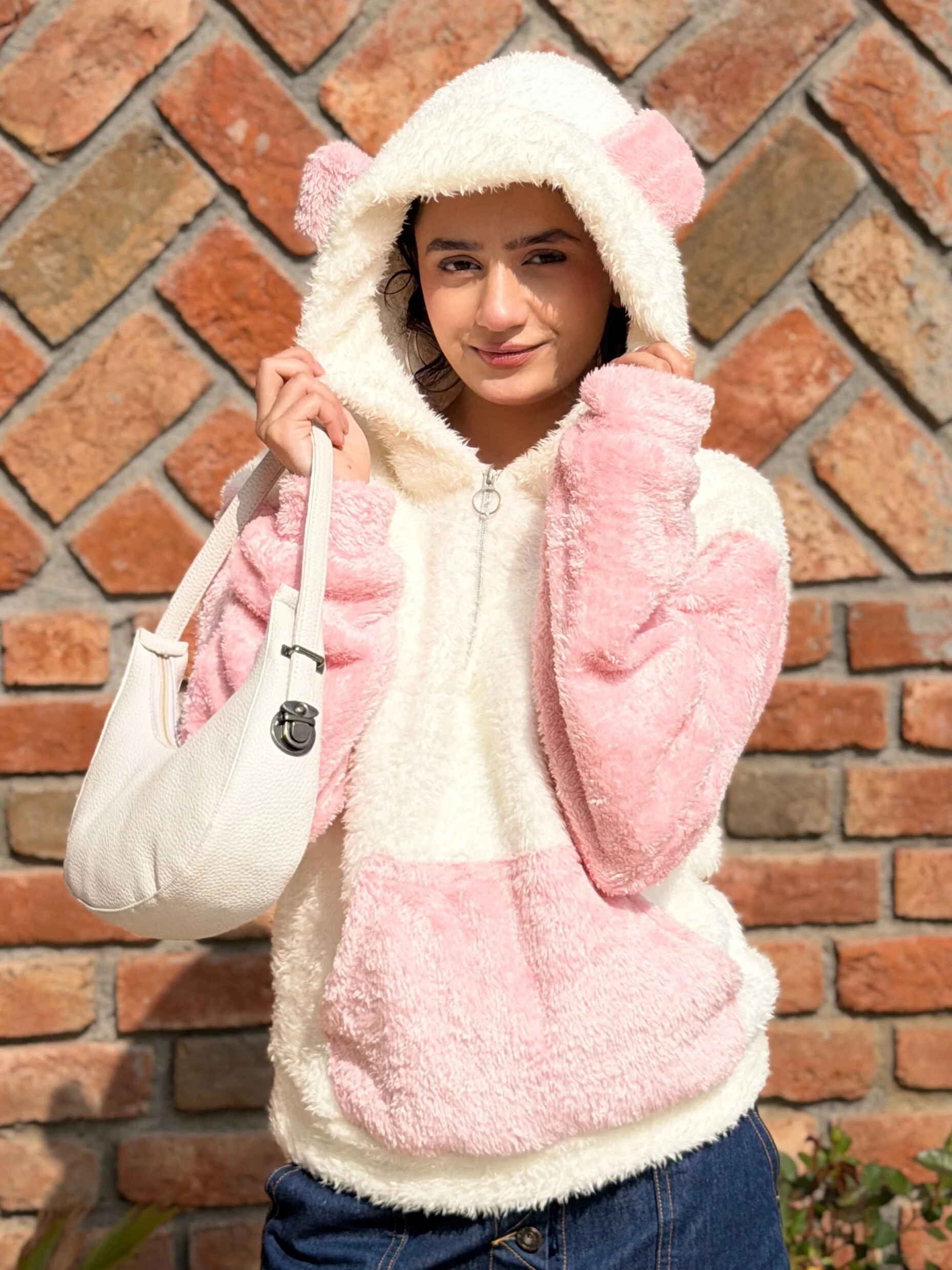 TANDUL Women Solid White and Pink Fur Hoodie